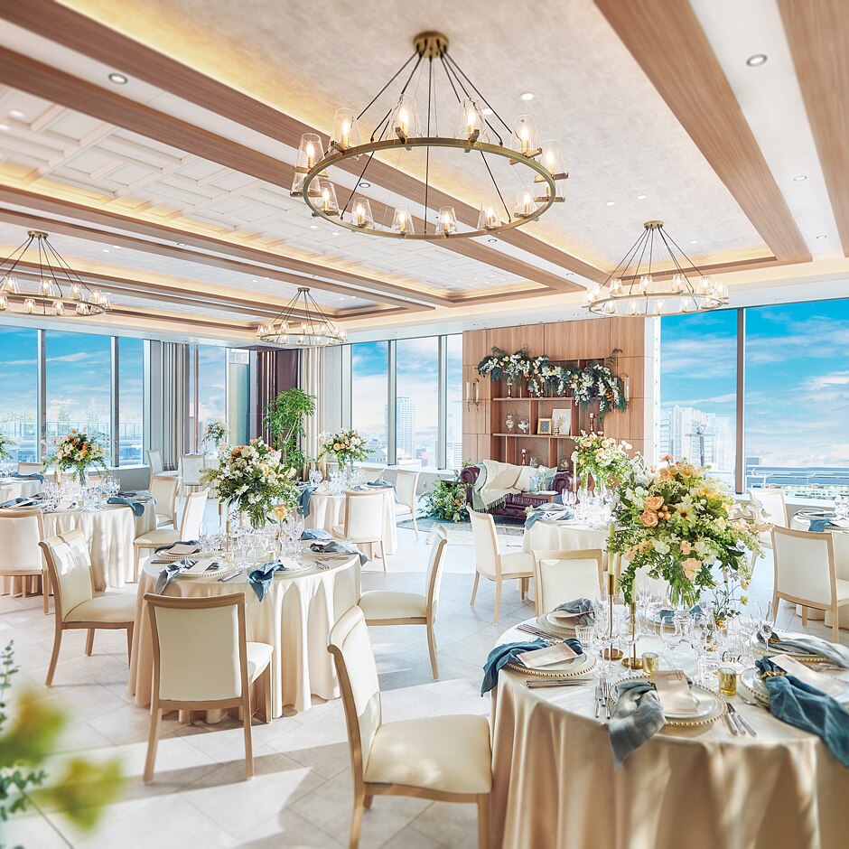 高層階のパーティ会場にはたっぷりの自然光が射し込む。昼と夜で異なる表情を見せる空間を楽しんで。