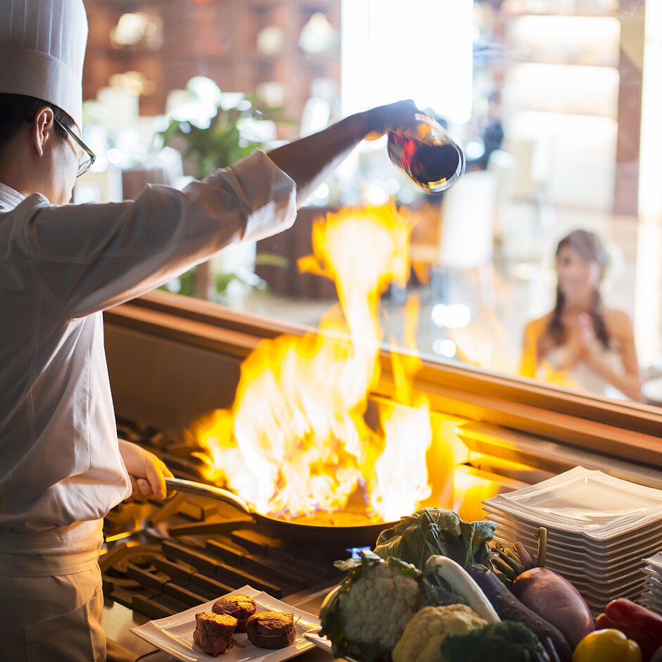 オープンキッチンからの香りや音で料理への期待が高まる。美味しい料理に舌鼓を打ちながら、和やかなパーティーを楽しんで