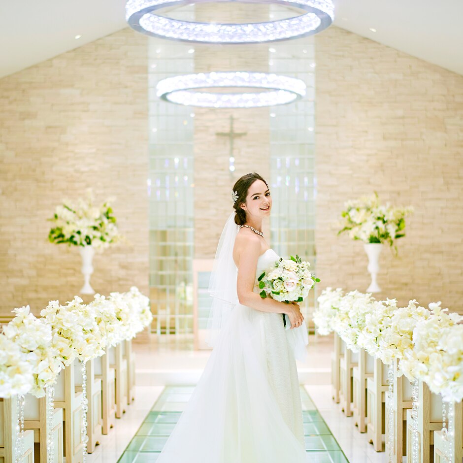 美しい銀世界をモチーフにしたレンガ造りのクリスタルチャペル。透き通るバージンロードと、永遠を意味するリング型のシャンデリアがドレス姿をさらに輝かせ、幻想的な空間を演出する。