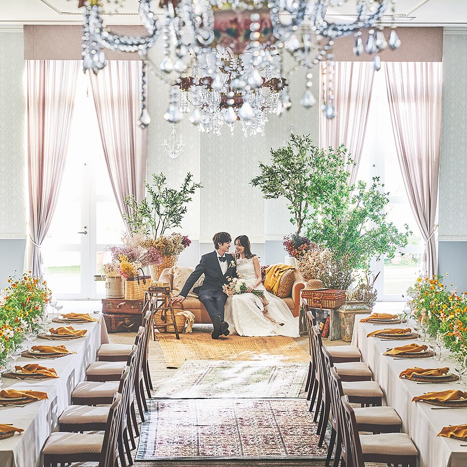 シックから大人可愛いコーディネートまで、ふたりの好みに合わせて叶える開放的なパーティ会場