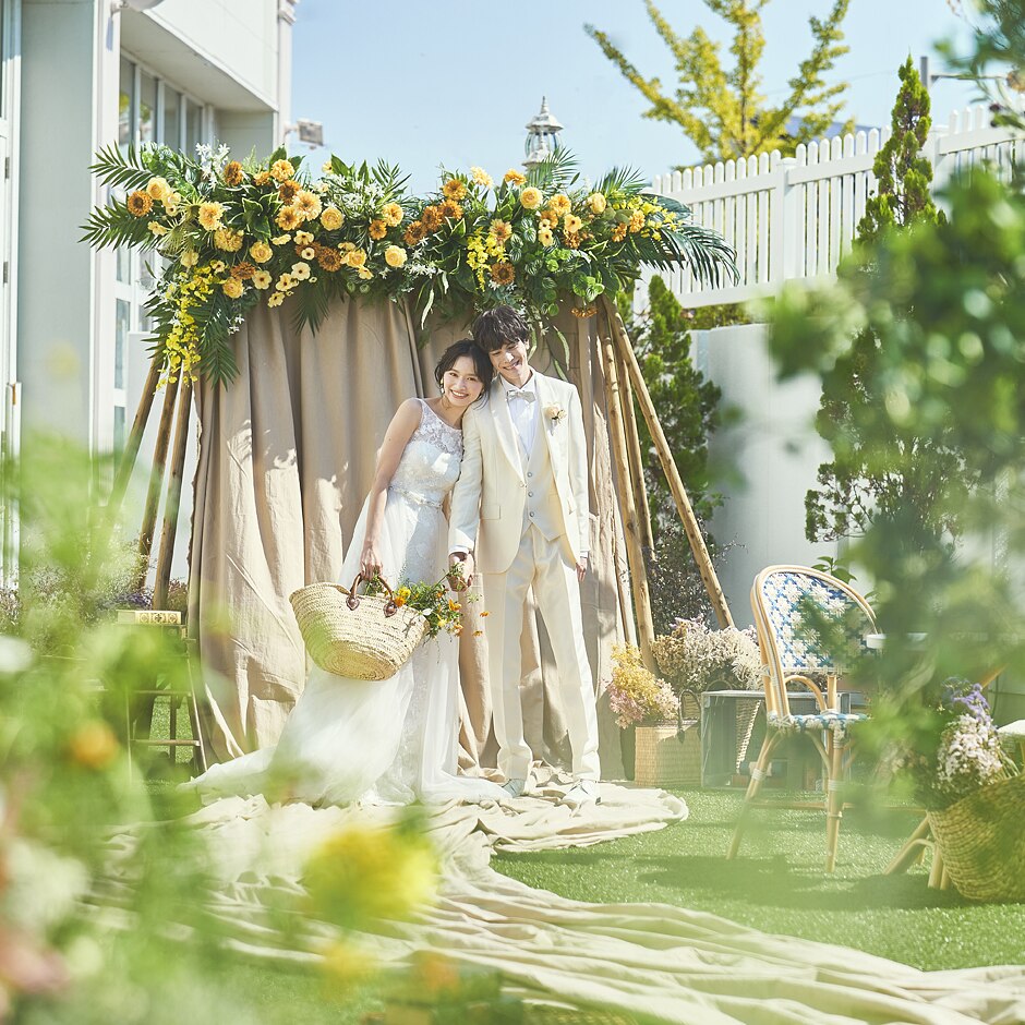 開放感に満ちたガーデン付きのパーティ会場では、ふたりの好みに合わせたコーディネートでゲストをもてなして。どこを切り取っても絵になるフォトジェニックな空間で、こだわりの一枚を残してほしい。
