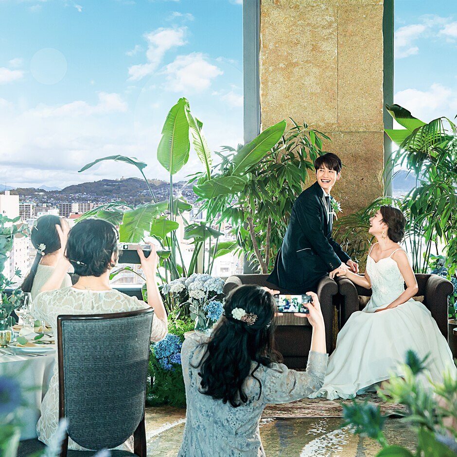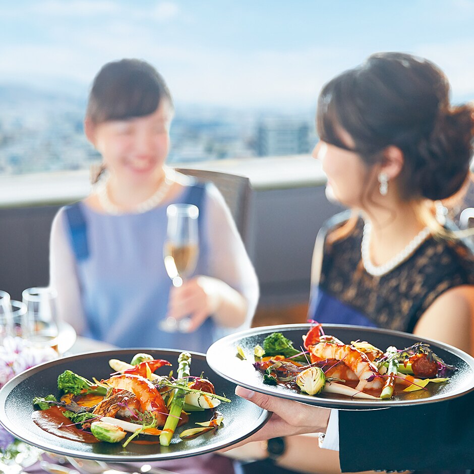 最上階【ソルプレーサ】は、フロア貸切で景色と食事を楽しめるオープンキッチン付の人気会場。ゲストと優雅に寛げる上質なバンケットなど、スタイルや好みで選べる多彩なパーティ空間があるので、ぜひ見学に訪れて。