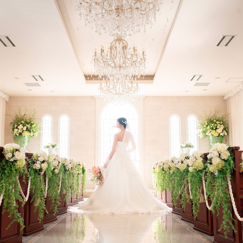 落ち着いたオフホワイトのレンガ、誓いの祭壇には未来を照らす光差し込む大きな窓