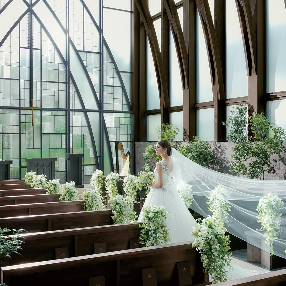 天井高・バージンロードともに13mという圧倒的なスケール感で訪れた人々を魅了するチャペル。祭壇前の窓には透明のステンドグラスが用いられ、一枚一枚異なる表情でふたりを見守る。人前式や和装挙式も可能