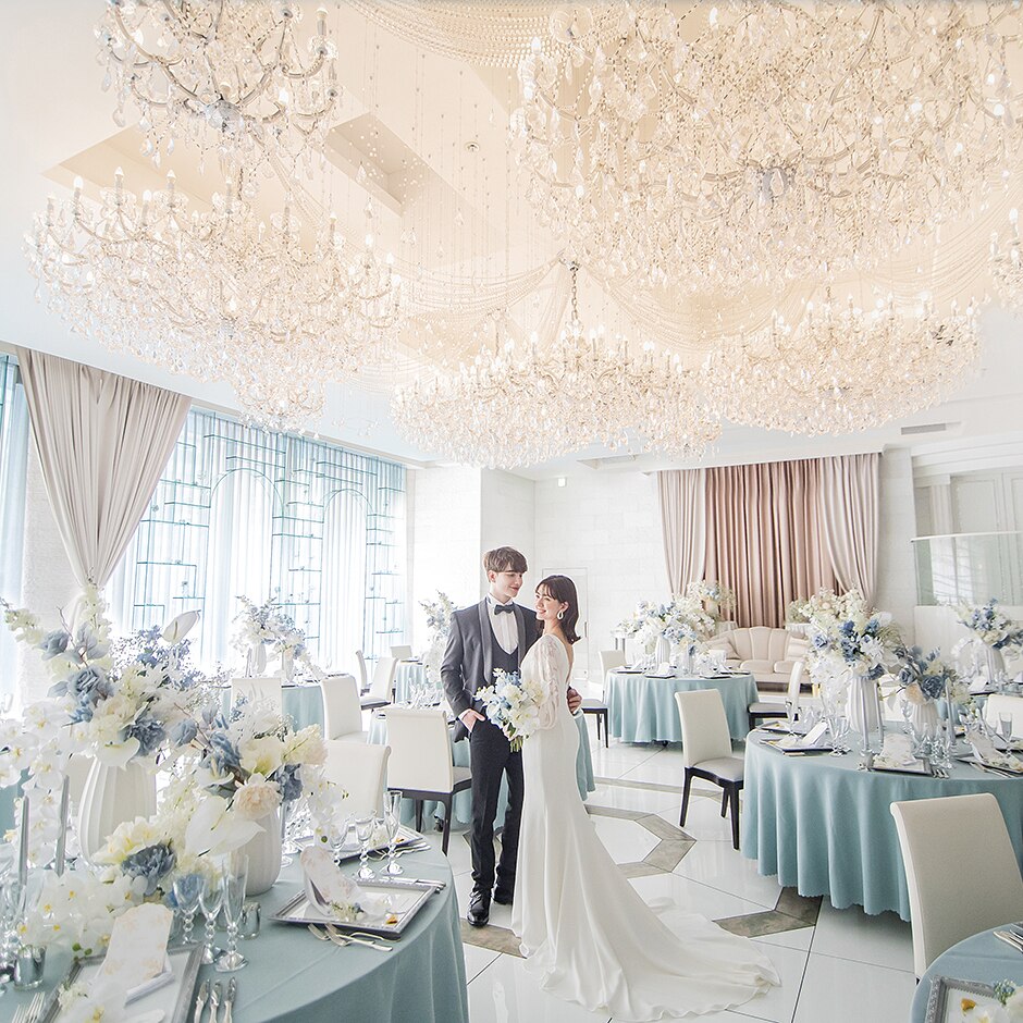 白を基調とした上品なパーティ会場はシャンデリアや階段入場などこだわりが詰まった空間。カラー次第で雰囲気をガラリと変えられるのも魅力!クロスや小物など細部までこだわることができるのでふたり好みに彩って。