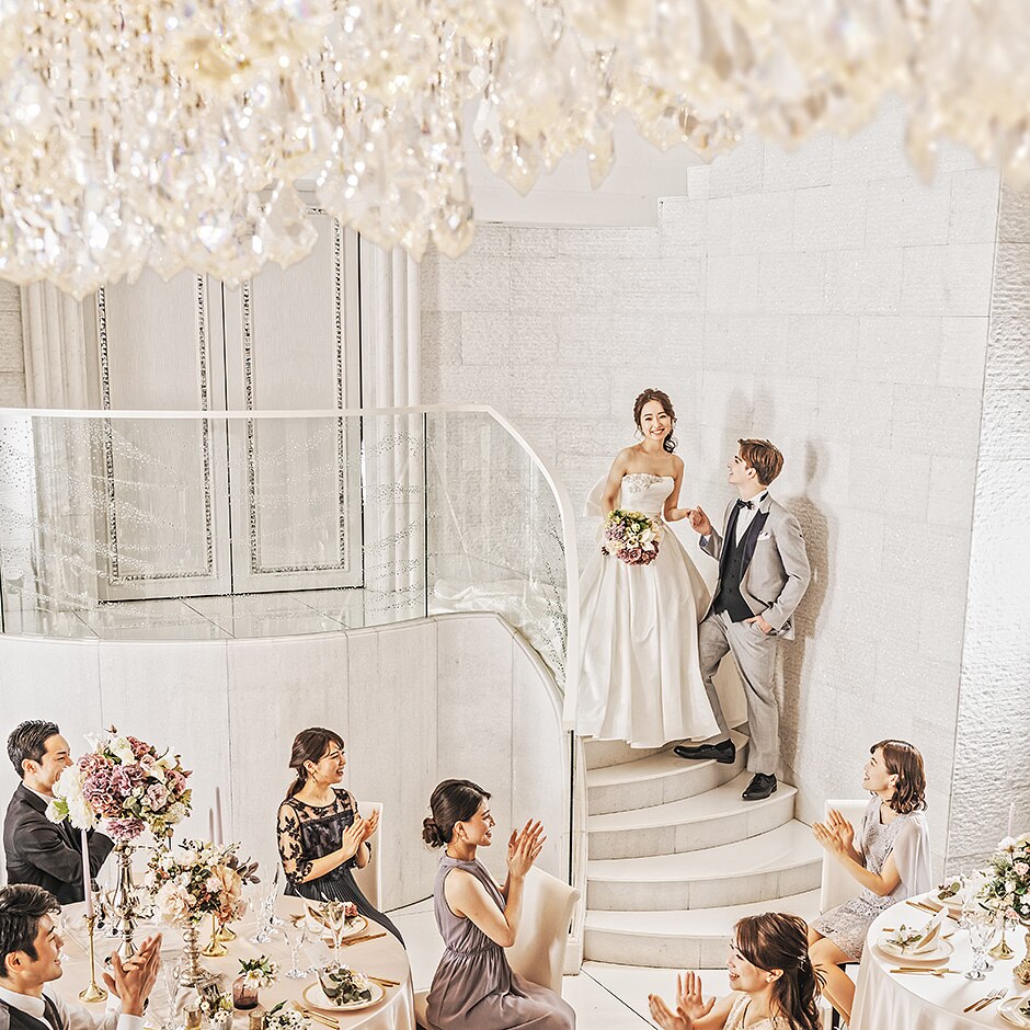 パーティ会場をはじめ、ロビーやホワイエなど館内は隅々までフォトジェニックな空間。シャンデリアや大階段からの入場など、花嫁の美しさをさらにワンランクアップさせるこだわりの世界観を詰め込んだ会場に注目を!