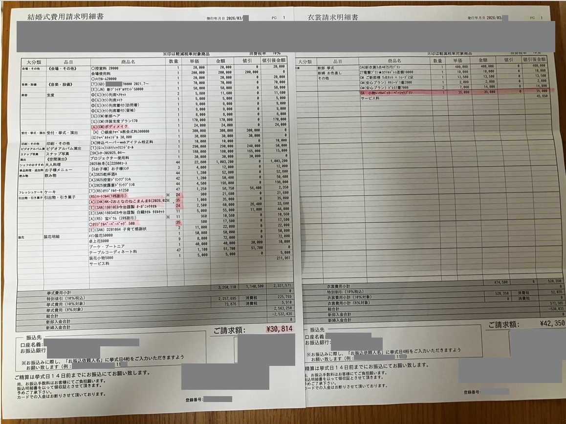 ※投稿された金額情報は、日取り、申込みのタイミングや会場の空き状況等によって異なるため、最終費用明細の項目や金額をもとにした、式場との価格交渉や追加サービス等の要望はご遠慮ください。