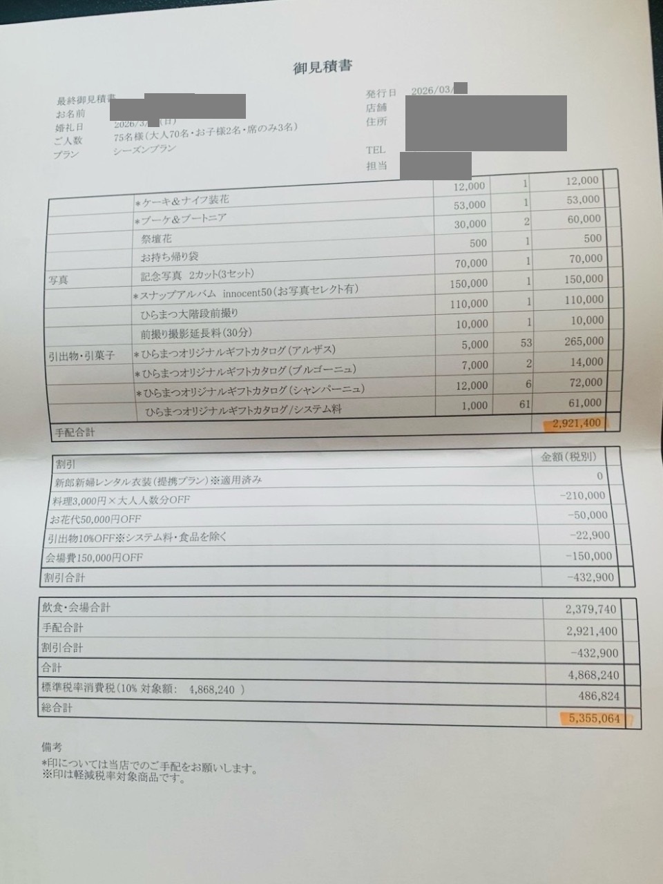 契約10月、挙式日が3月と準備期間が短かったため、その分の割引がありました(シーズンプランという名前でした)。
