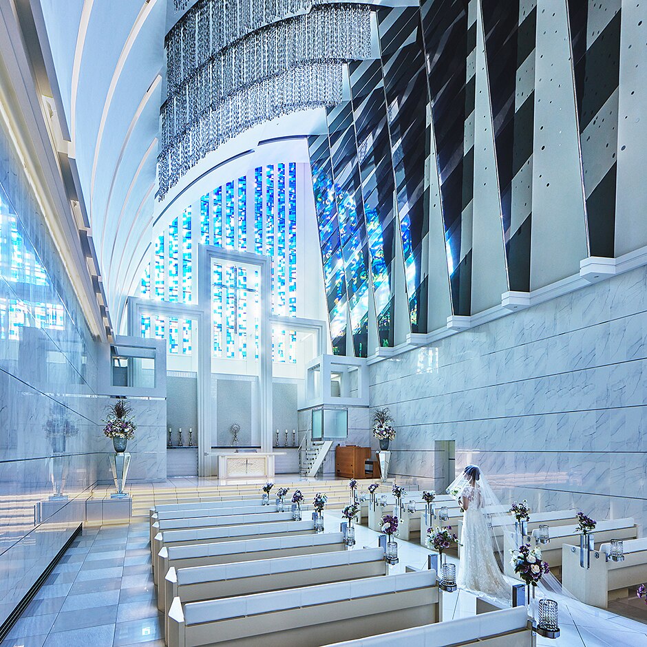 青く輝くステンドグラスが印象的で、サムシングブルーの光が堂内に降り注ぎ、花嫁を美しく引き立ててくれる