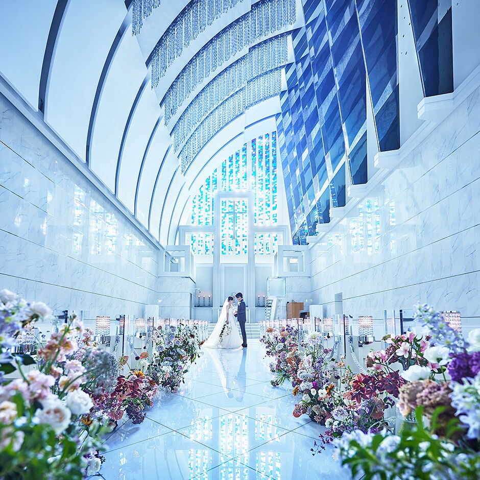 神戸の海と太陽を表現した2つの挙式会場。ブルーのステンドグラスが幻想的でドラマチックな挙式が叶う全天候型の挙式場