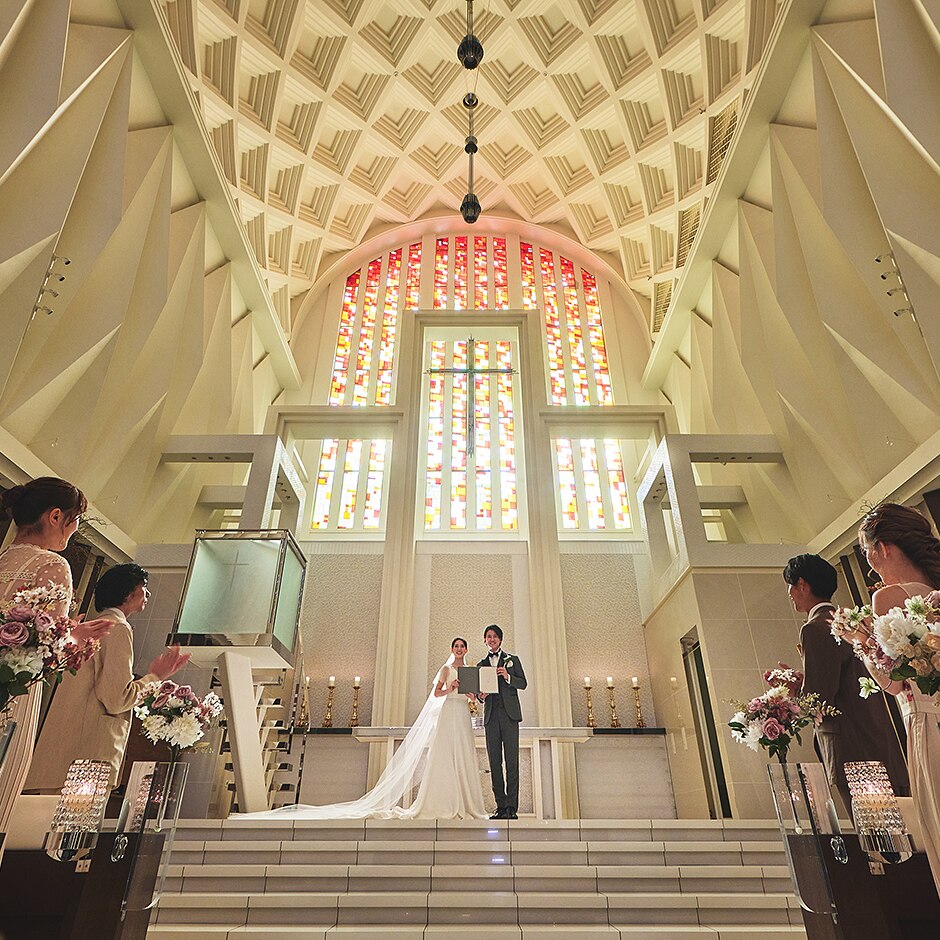 大聖堂は温かな陽光を思わせる「West」とブルーのステンドグラスが印象的な「East」の2つから好みで選ぼう。高いアーチ天井にはフルートやオルガンの音色、聖歌隊の歌声が響き渡り、挙式の感動を高めてくれる