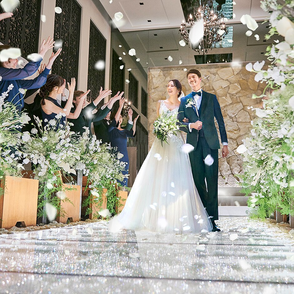 永遠の輝きを意味する「ダイヤモンド」に思いを込めて作られた光のチャペル。バージンロードに敷き詰められた40万個ものクリスタルがキラキラと輝き花嫁の歩みを照らしてくれるので、感動のセレモニーが叶う。