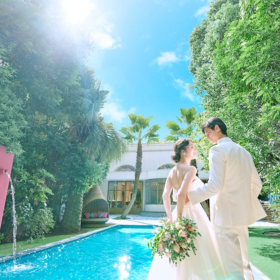 【緑豊かなオリエンタルリゾート】風にそよぐパームツリー、心地よい水のせせらぎ、緑が間近の独立型教会、選べる3つの貸切邸宅、感動をよぶ演出の数々…。約2000坪のラグジュアリー空間で、ふたりの理想を形に。安心の適正価格や豪華5大特典も見逃さないで!