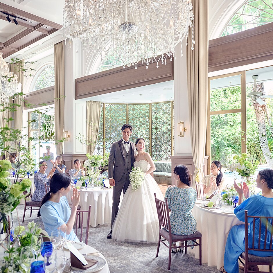 大きな窓の外には光煌めくテラスが広がり、四季折々の自然がパーティーをより艶やかに魅せてくれる。両家だけでの貸切利用も可能なのでフェアで相談♪