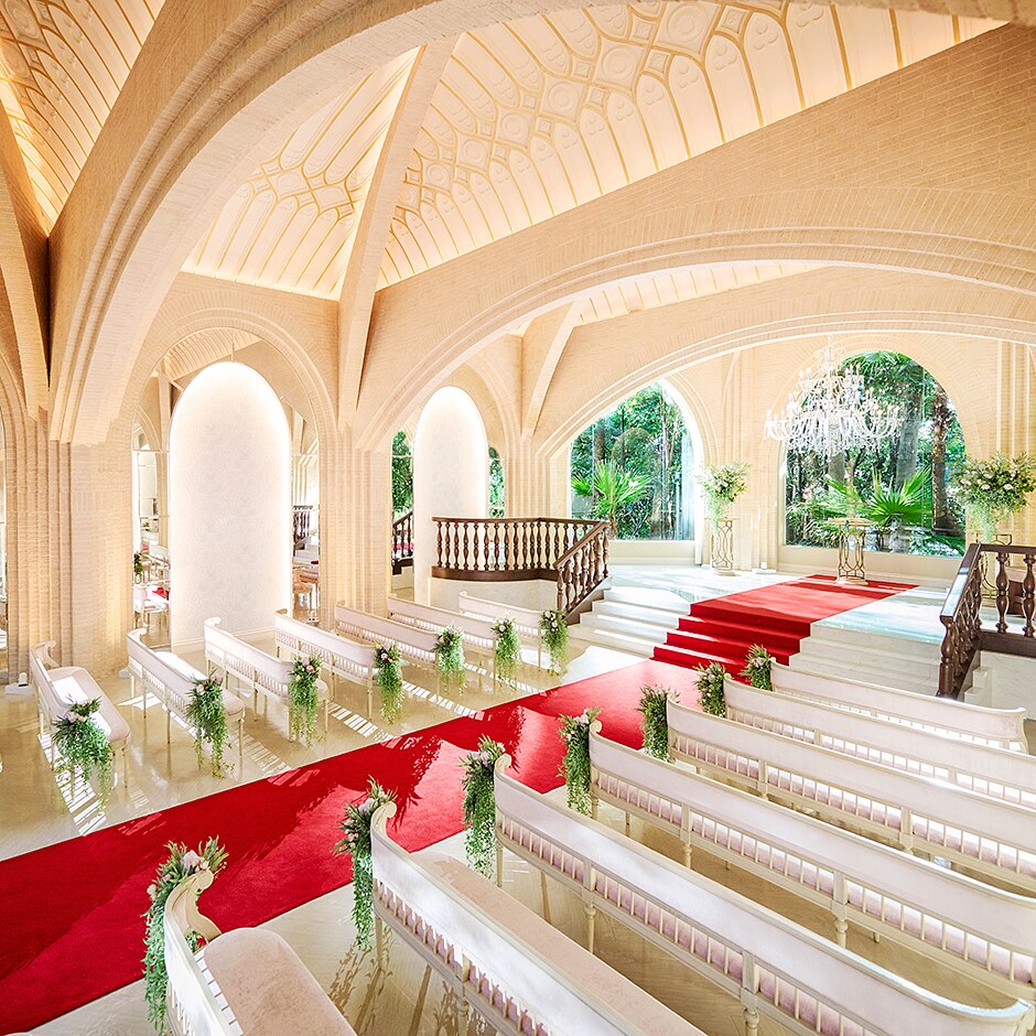 祭壇後ろの窓の外に広がるグリーンと真赤なバージンロードが純白のウェディングドレスを素敵に引き立てる -