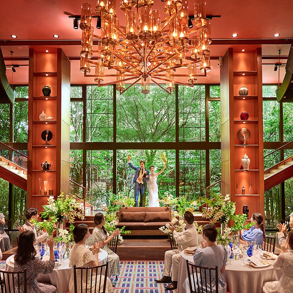 大きな窓の外には光煌めくテラスが広がり、四季折々の自然がパーティーをより艶やかに魅せてくれる。両家だけでの貸切利用も可能なのでフェアで相談♪