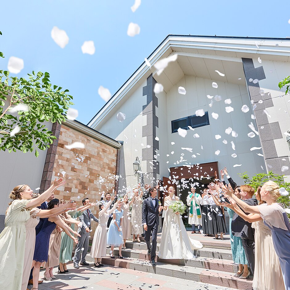青空の下、ゲストからの祝福のフラワーシャワーを。