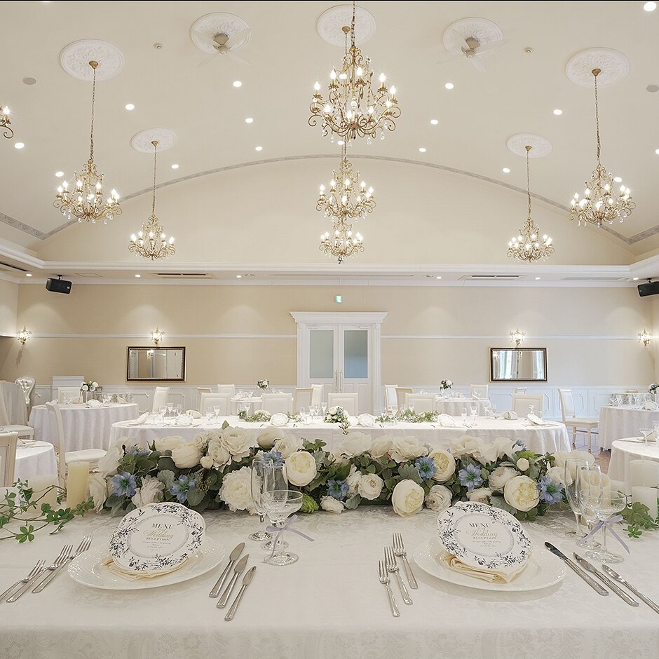 おふたりのゲストの構成や人数によって最適なレイアウトをご提案いたします。また横長の会場のため、ゲストのお顔が良く見える、ゲストとの距離が近く感じられるレイアウトになっているのも特徴です◎ -