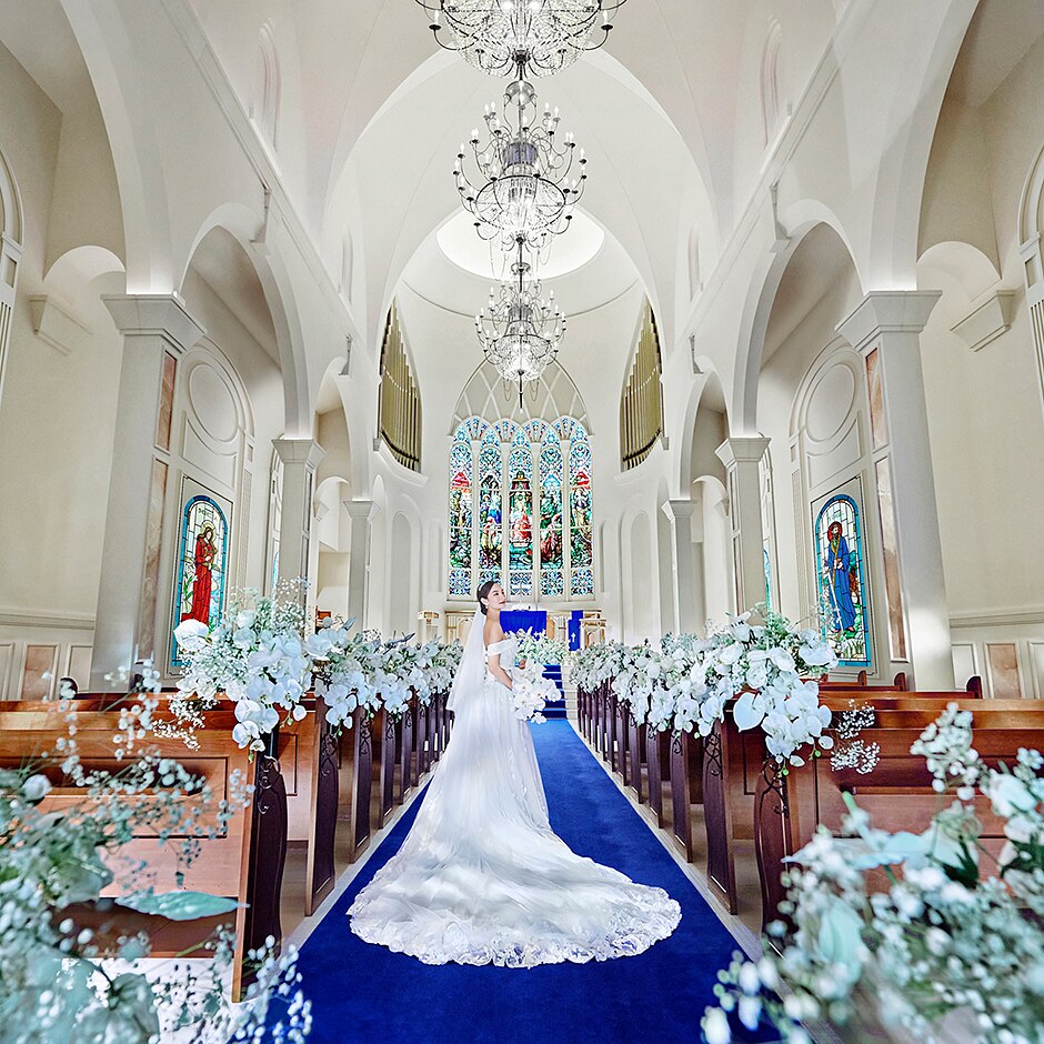 一生に一度の真っ白なドレスが映えるロイヤルブルーのバージンロード -