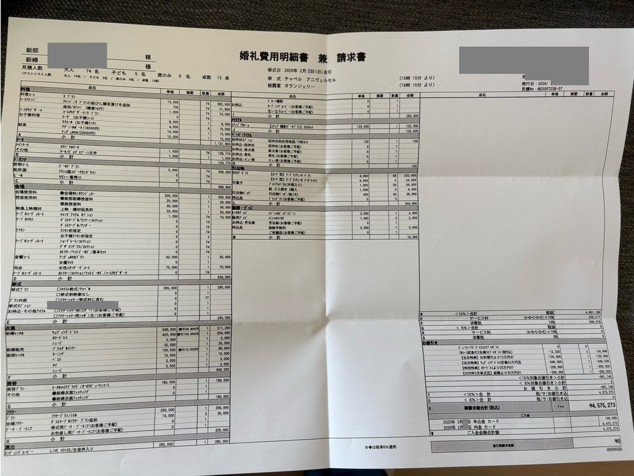 ※投稿された金額情報は、日取り、申込みのタイミングや会場の空き状況等によって異なるため、最終費用明細の項目や金額をもとにした、式場との価格交渉や追加サービス等の要望はご遠慮ください。