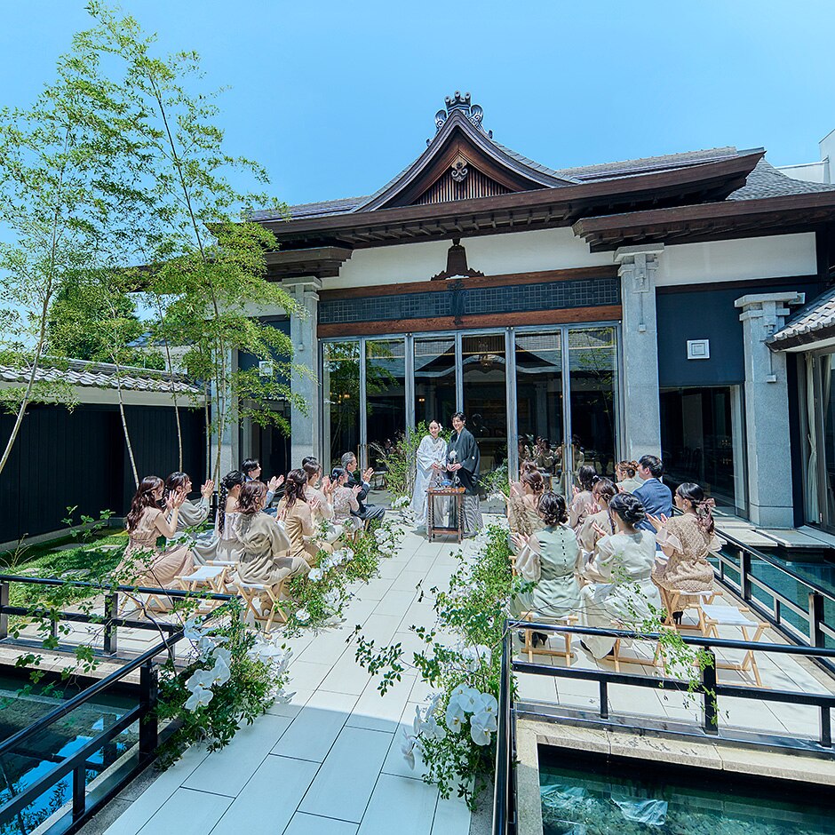 ときを超えて愛され続ける花のように、ふたりの未来に幾百もの花が咲くように…そんな願いが名前に宿る「百花籠」。敷地内には和と洋、伝統とモダンといった相反する空間が共存し、どう組み合わせるか次第で花嫁の印象を自由に変えることができる