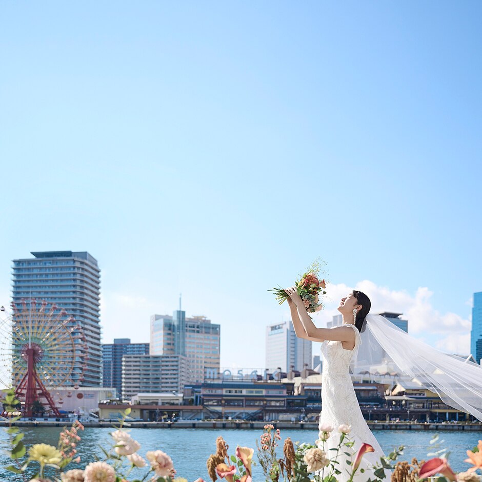 澄み渡る青空の下、広がる開放感と煌めくハーバービューが、ふたりの新たな人生の幕開けを祝福するかのように、心に残る美しい瞬間を彩ってくれる。特別なロケーションを背景に、ふたりで幸せに満ちた一枚を刻んで。