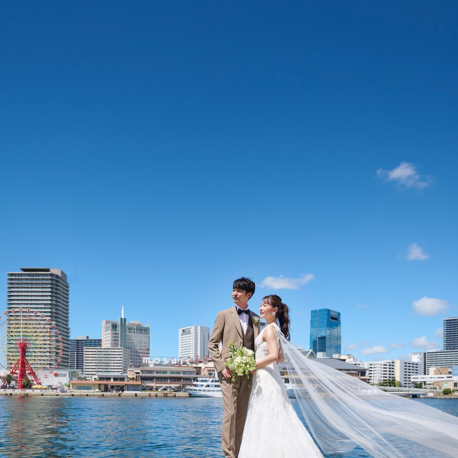 澄み渡る青空の下、広がる開放感と煌めくハーバービューが、ふたりの新たな人生の幕開けを祝福するかのように、心に残る美しい瞬間を彩ってくれる。特別なロケーションを背景に、ふたりで幸せに満ちた一枚を刻んで。