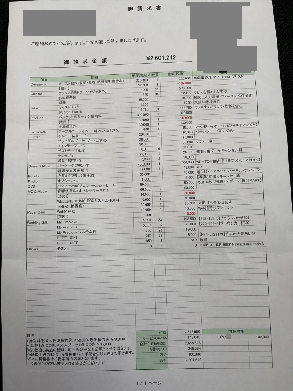 ※投稿された金額情報は、日取り、申込みのタイミングや会場の空き状況等によって異なるため、最終費用明細の項目や金額をもとにした、式場との価格交渉や追加サービス等の要望はご遠慮ください。