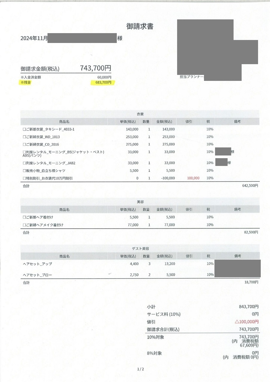 ※投稿された金額情報は、日取り、申込みのタイミングや会場の空き状況等によって異なるため、最終費用明細の項目や金額をもとにした、式場との価格交渉や追加サービス等の要望はご遠慮ください。