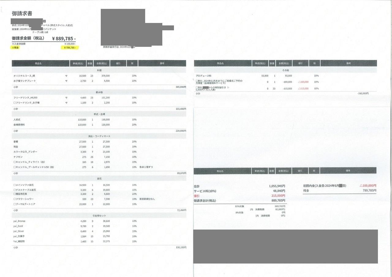 ※料金実例では申込金などを含む会場に支払った"総額"を表示しています。また、料金明細画像の項目名をもとに独自の基準で分類しています。