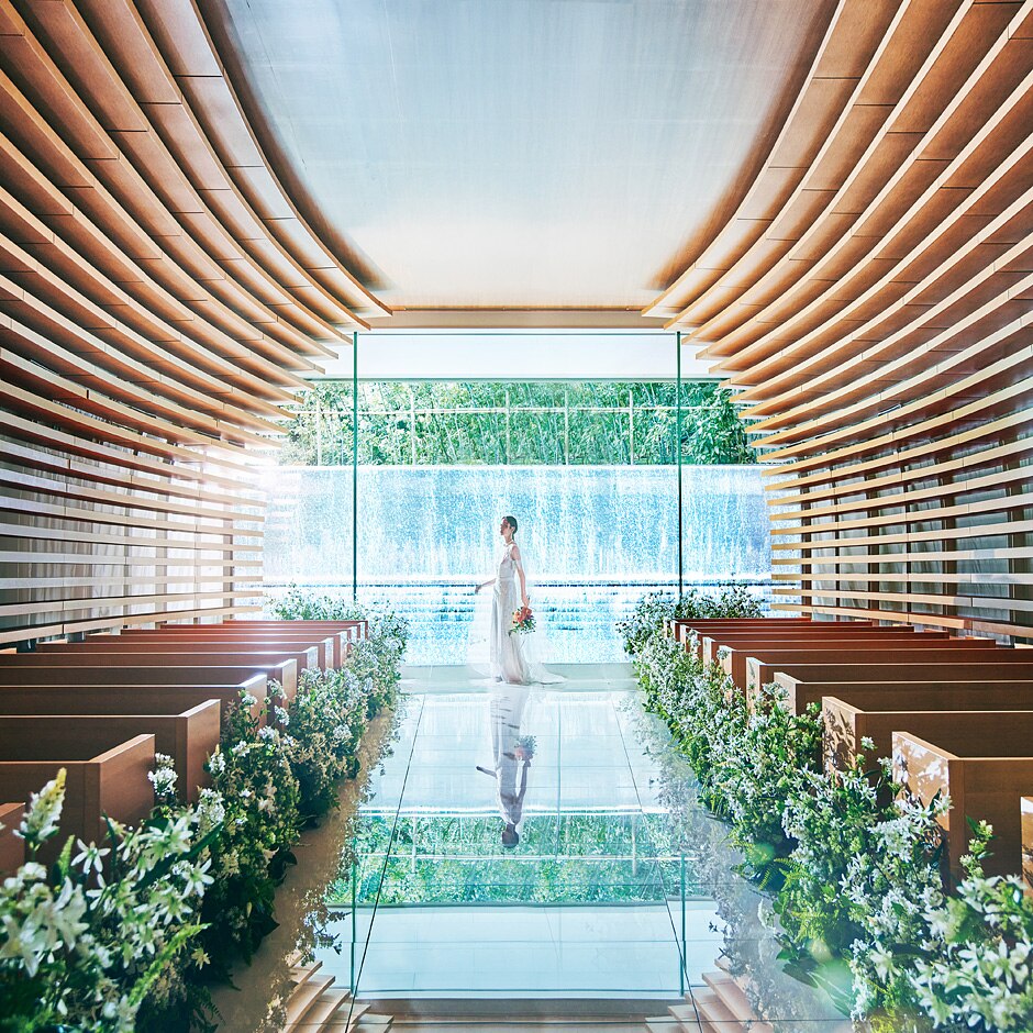 柔らかな陽光が正面の滝の水に反射し、美しく煌めく幻想的なチャペル