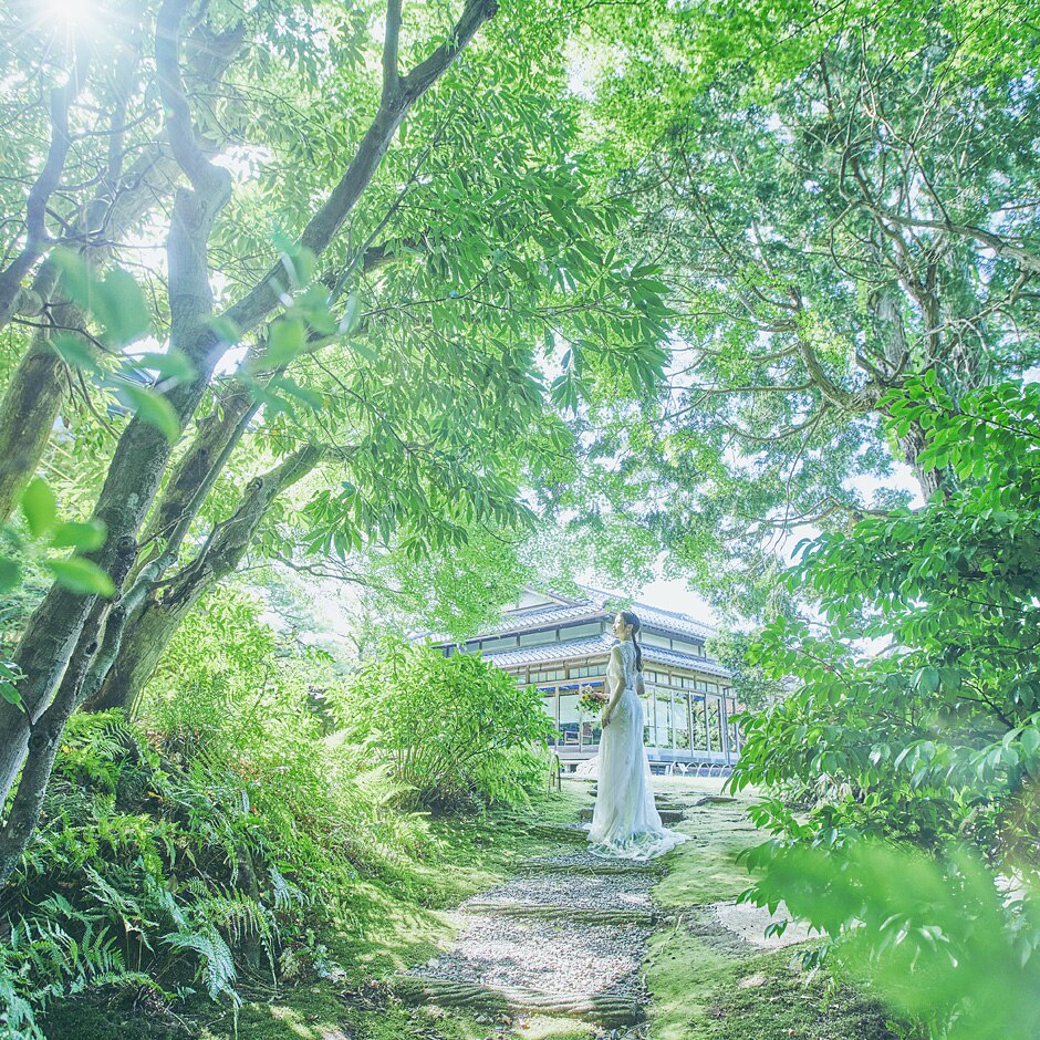 高さ5mもの天井まで届くガラスの窓二面に広がるのは、圧巻の回遊式庭園。四季折々に異なる移ろいを見せる美しい景色が、特別なおもてなしに。庭園内には、少人数ウエディングに最適な貸切邸宅『別邸』も。