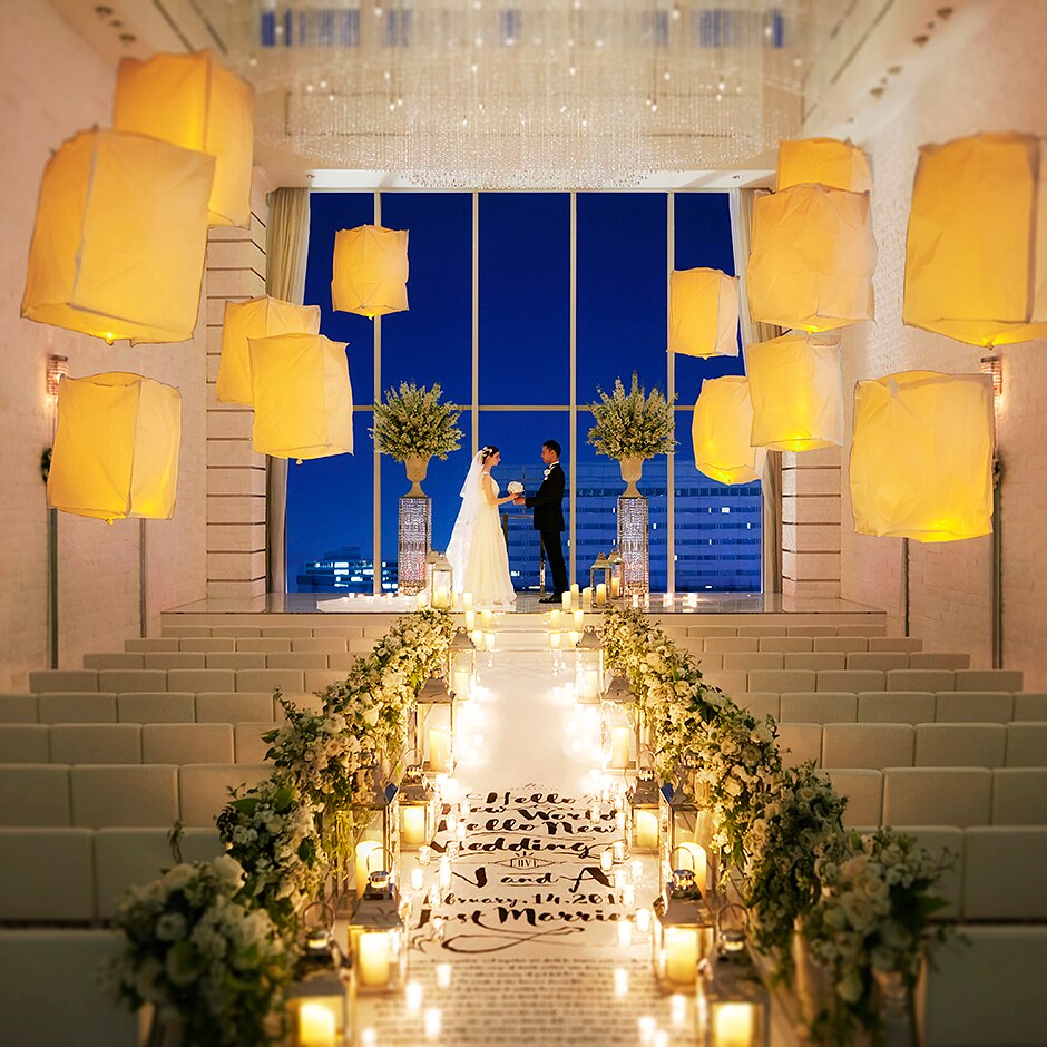 ロマンティックなランタン演出で夜空に浮かぶ幻想的なナイトウエディングを