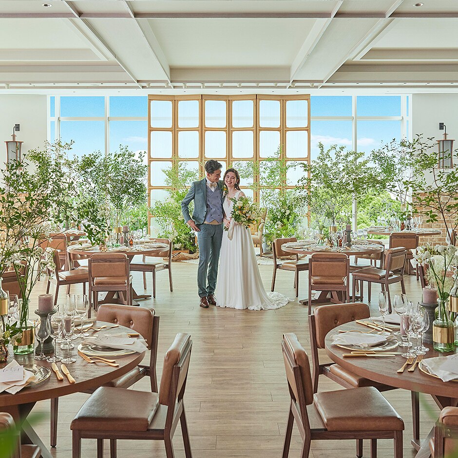 一面の窓から緑を見晴らす「モダンクリスタル」温かな自然光が空間いっぱいに満ちる光景はまさに至福のパーティそのもの。