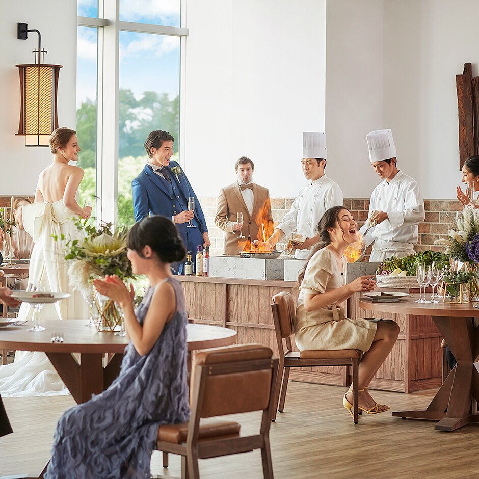 カジュアルスタイルでアットホームな雰囲気の結婚式にしたいなら『モダンクリスタル』がおすすめ。オープンエアなテラスも貸切だから、屋外演出を叶えたり、グランピングパーティを楽しんだり、自由に活用して