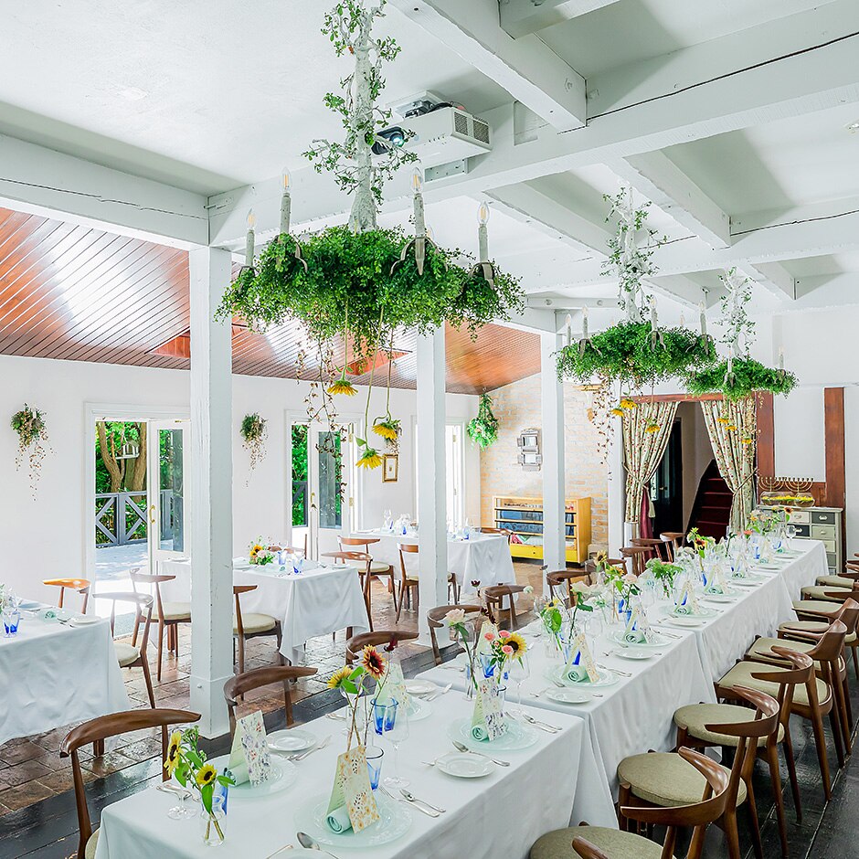 南フランスの邸宅をイメージしたテラス付の一軒家で、堅苦しくないパーティを実現。四季折々の自然が彩るテラスも自由に使用可能。当日はすべて貸切なので、周りを気にせずに楽しんで。会場専用バスの運行で、ゲストのアクセス負荷もかからないので安心。