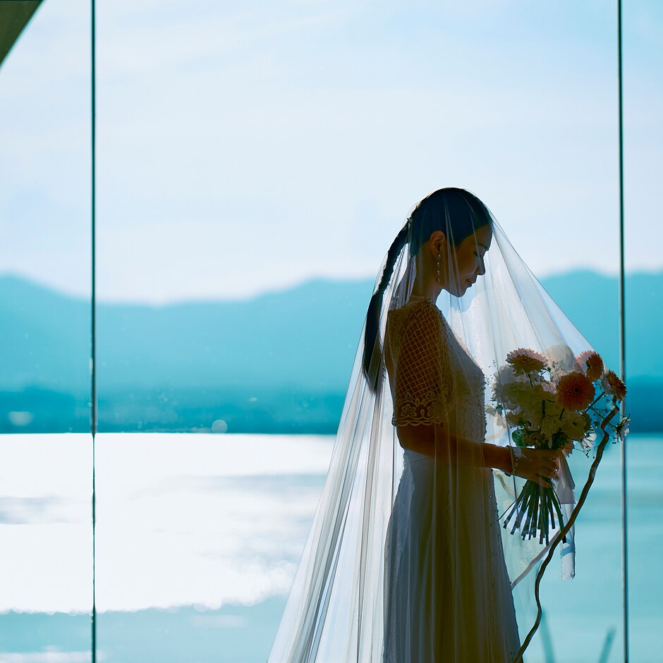 湖畔からの風がチャペルを吹き抜けると、天井に張られた弦が振動してやさしい音が鳴り響く。建築と景観の美しさが融合したチャペルでのセレモニーは、永遠を誓うふたりと誓いを見届けるゲストの心を癒してくれる。