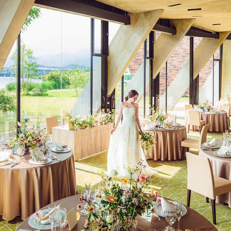 自然に囲まれた同ホテルには、豊かな緑と青空を望むオープンキッチン付きの会場が佇む。空間の使い方や演出は自由にアレンジOK。ふたりらしさをカタチにする方法をスタッフが一緒に考え、提案してくれるのも魅力的。