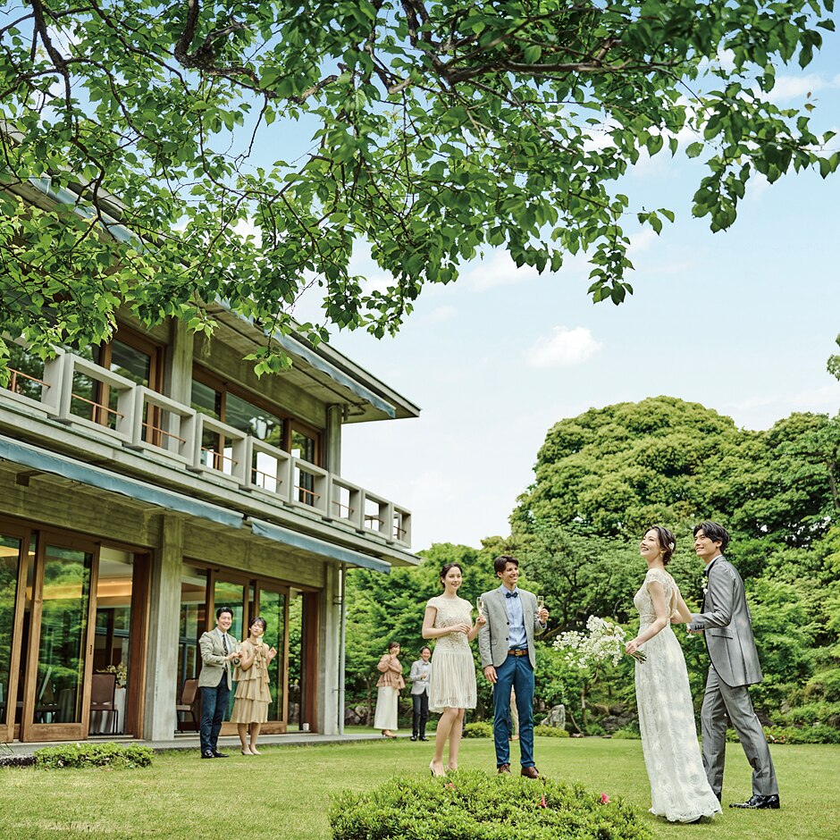 ル・コルビュジエの美学宿るモダニズム建築の傑作として、各界の著名人が名を連ねる会員制施設を結婚式のために特別開放。洗練された空間と四季折々の風情を愉しめる庭園は、ドレスも和装も美しく映える。