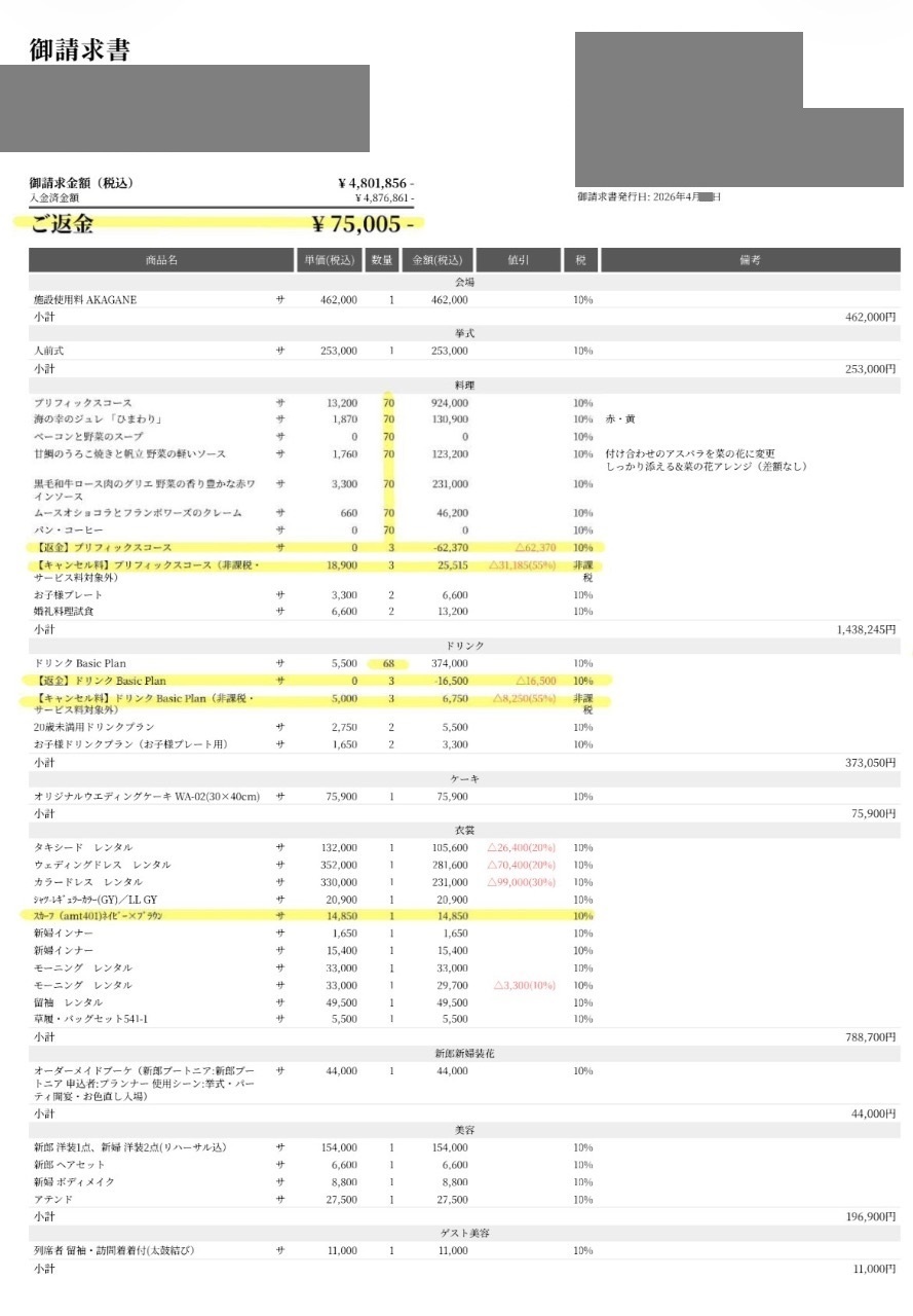 ※料金実例では申込金などを含む会場に支払った"総額"を表示しています。また、料金明細画像の項目名をもとに独自の基準で分類しています。
