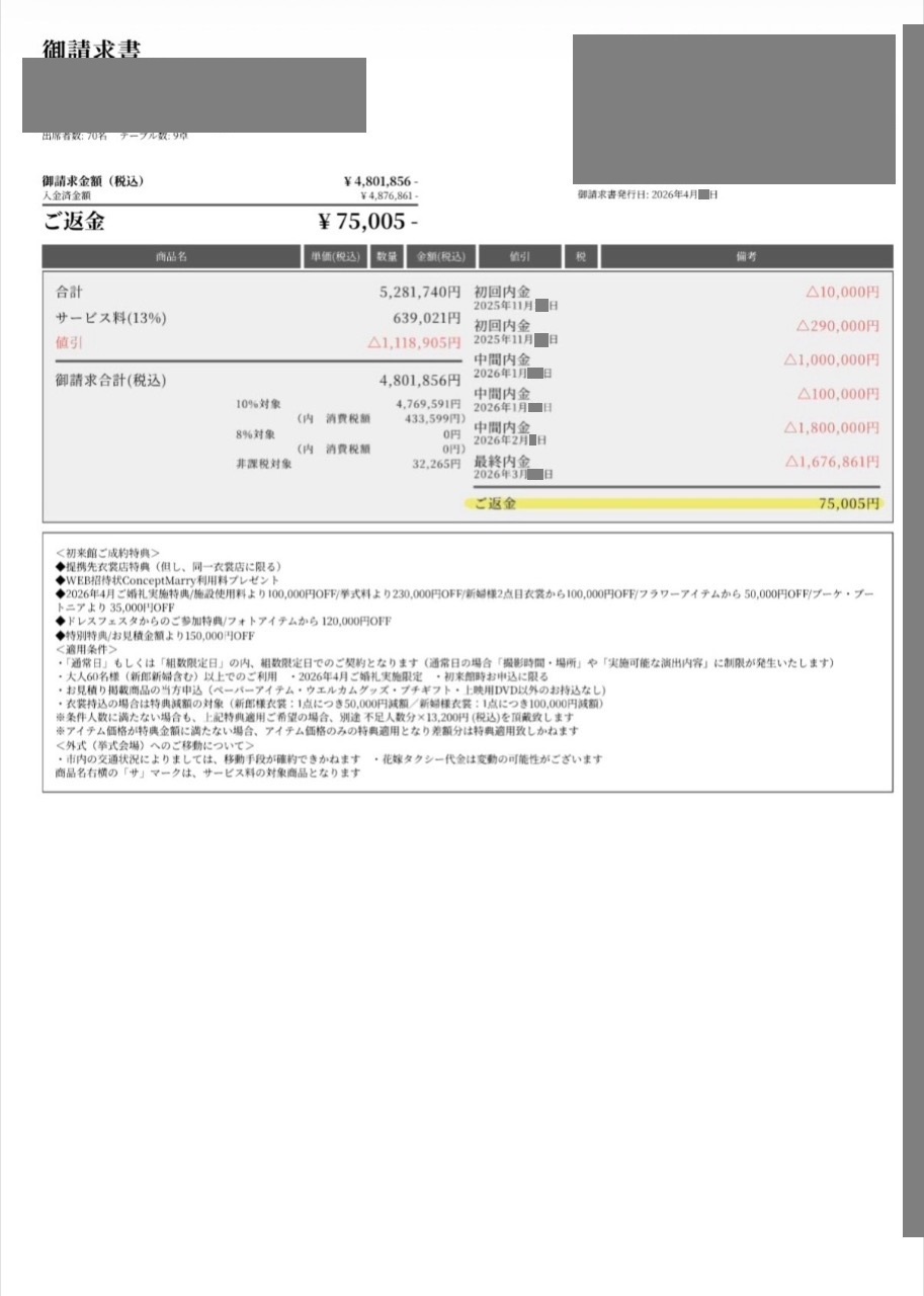 ※投稿された金額情報は、日取り、申込みのタイミングや会場の空き状況等によって異なるため、最終費用明細の項目や金額をもとにした、式場との価格交渉や追加サービス等の要望はご遠慮ください。