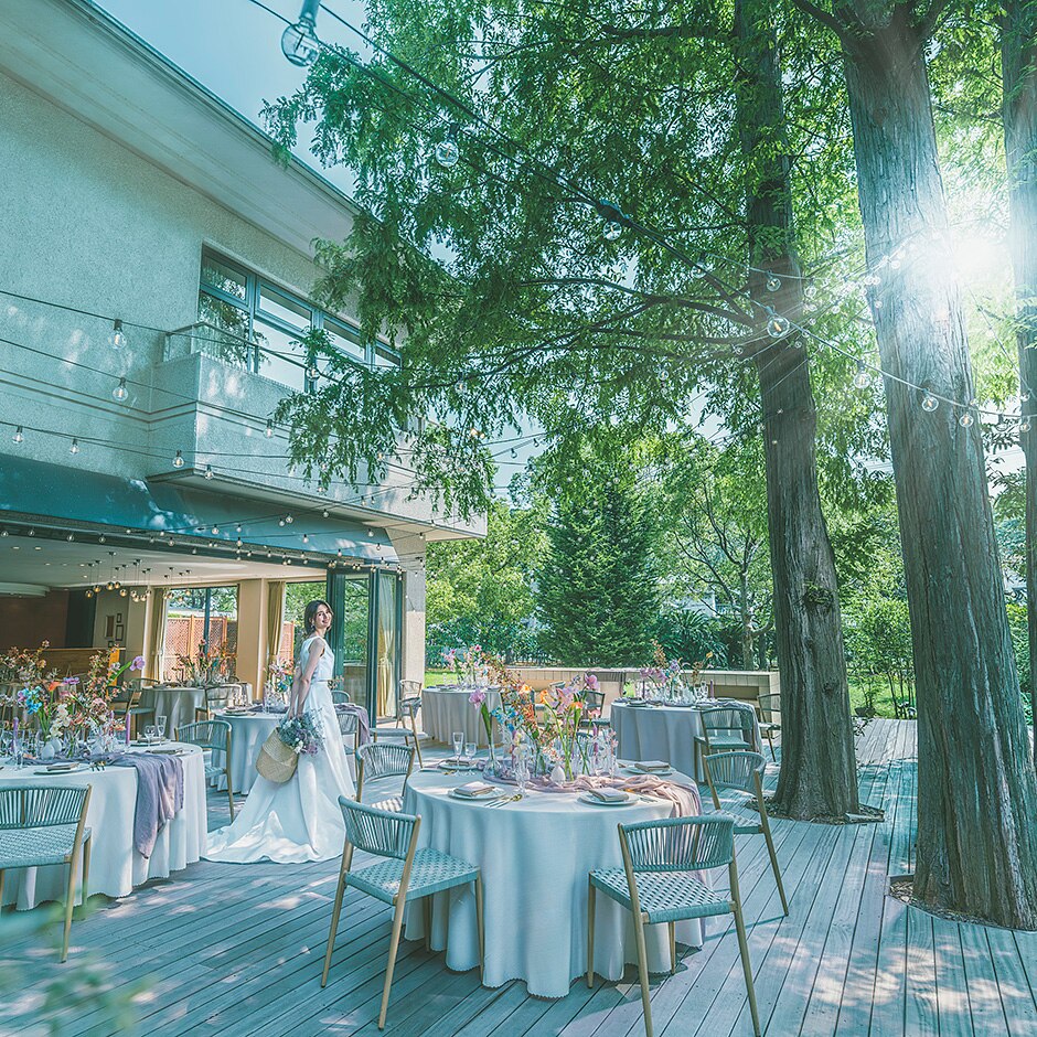 オープンテラスとガーデンをひとつなぎにした開放的なパーティースペース 自由な歓談をなるべく多くとってガーデンも満喫しよう