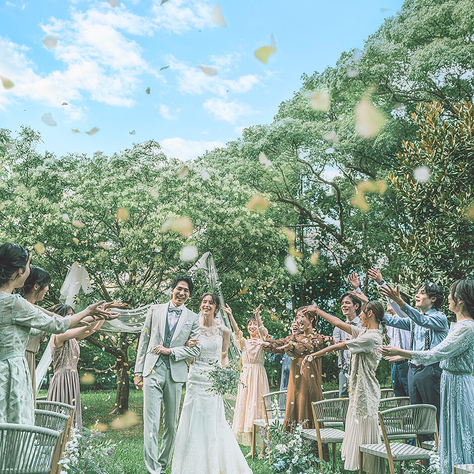 木々の緑や開放的な空に囲まれた祝福を 人数制限もなく招待した皆様とともに誓う人前式を