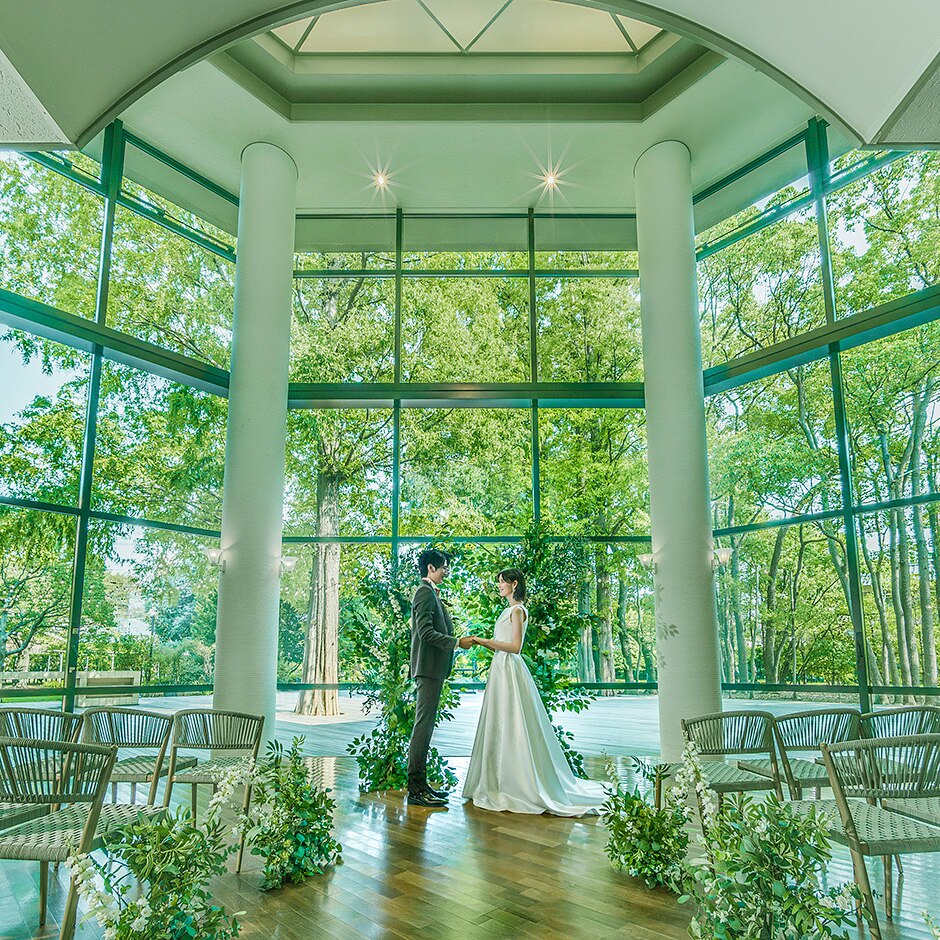 春には桜 夏には新緑 秋には紅葉 冬には光が差し込み季節感を前面に感じる誓いの場 雨天を気にせず雄大な景色を眺める挙式の時間を