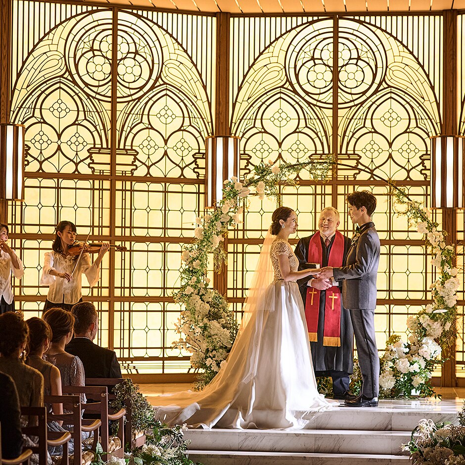 天井高7m、バージンロードの長さは15mの大空間。ステンドグラスの煌めきと、職人の手彫りによるレースのような彫刻が視界に広がり、訪れた者をたちまち魅了する。宗教色を感じさせない造りなので人前式も好評
