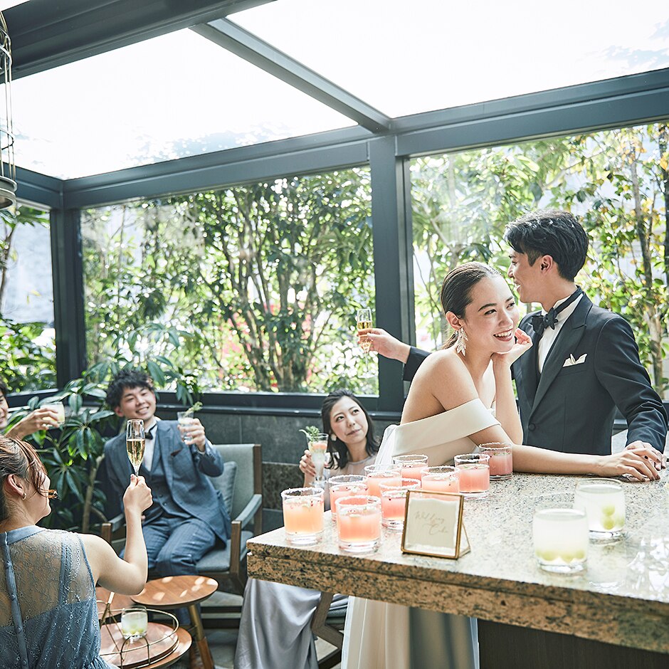 鮮やかな緑を望むバーカウンターがゲストを迎える
