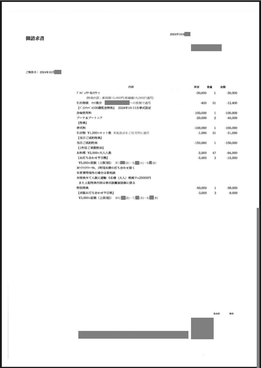 ※投稿された金額情報は、日取り、申込みのタイミングや会場の空き状況等によって異なるため、最終費用明細の項目や金額をもとにした、式場との価格交渉や追加サービス等の要望はご遠慮ください。