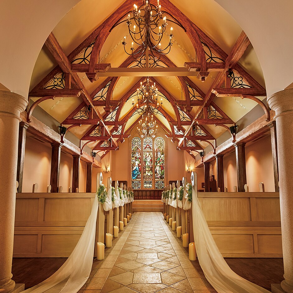 木造りならではの温かさとシャンデリアの輝きに包まれるアンティークな趣のチャペル。家族や友人などを近くに感じられるアットホームな空間が魅力。そのほか、ガーデンでの人前式や武田神社での神前式も叶えられる。