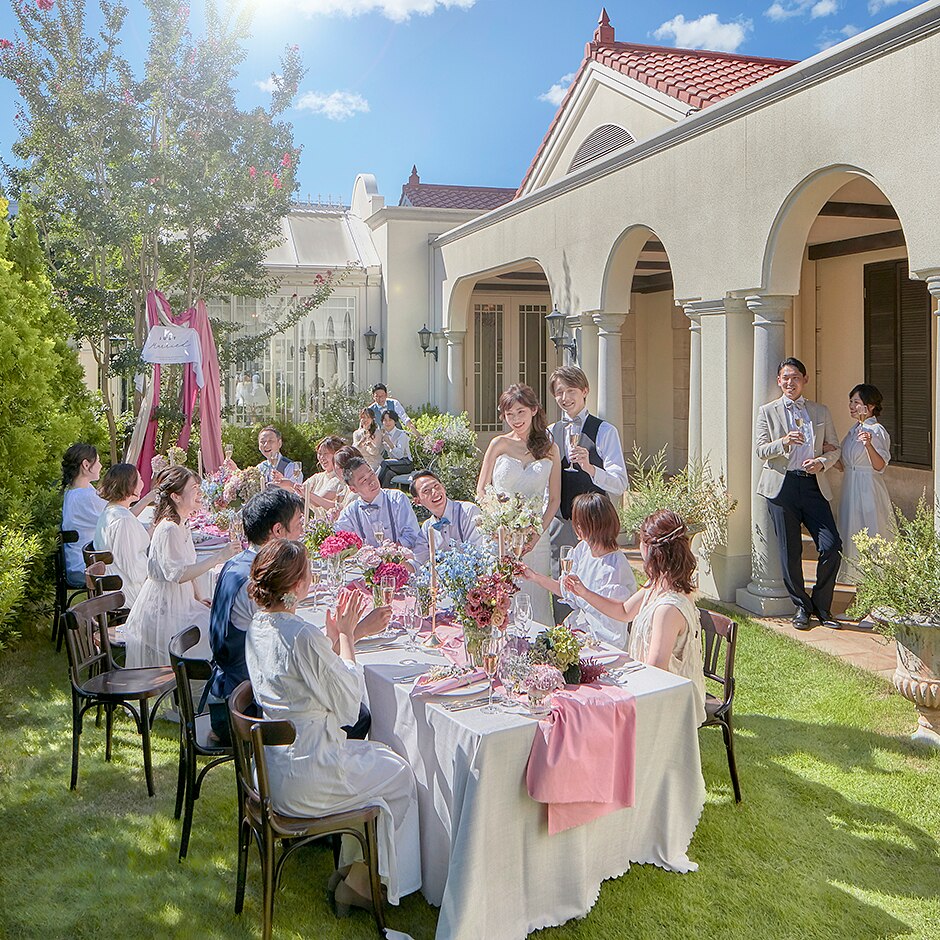ガーデンでのセレモニーも大人気。肩肘はらず、ふたりらしい誓いのカタチを表現したいならおすすめ -