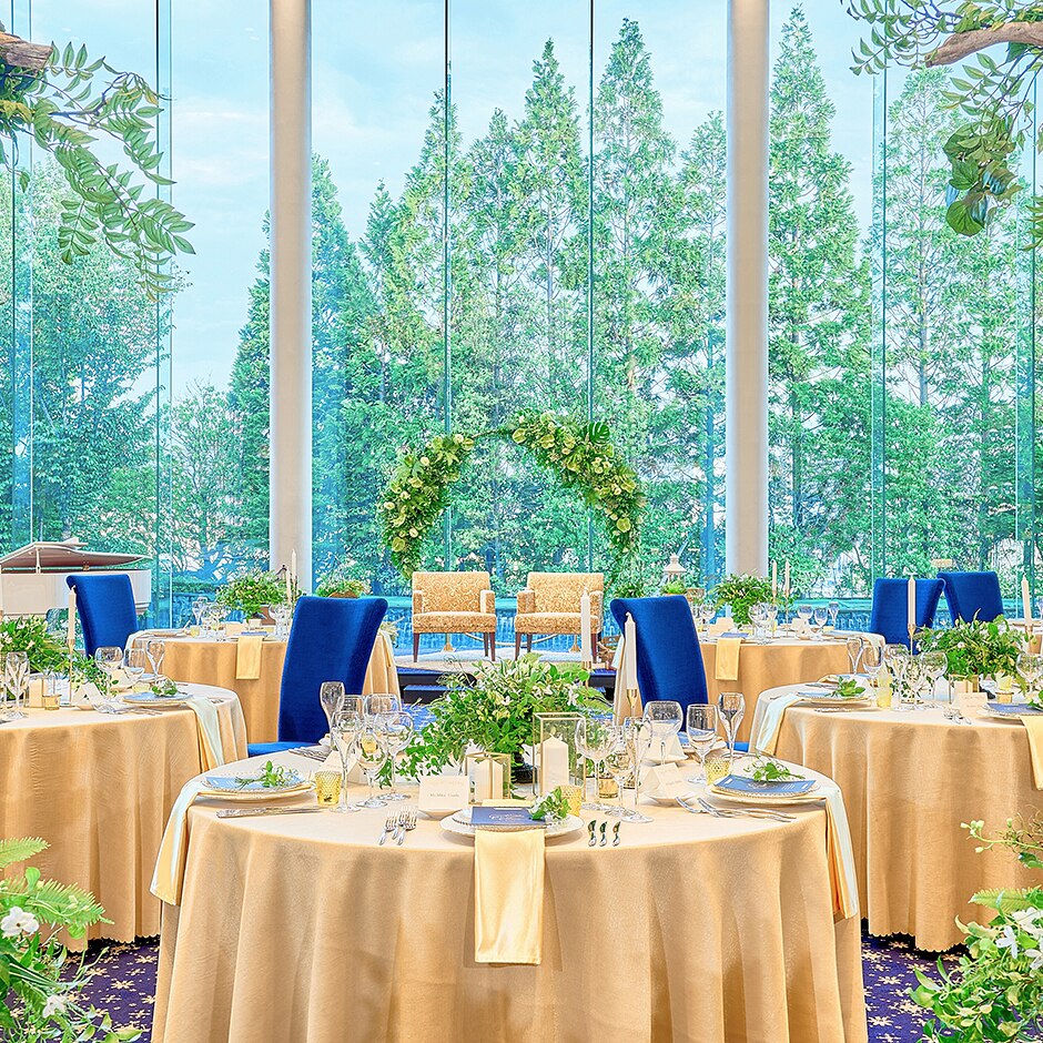 厳かな挙式シーンから一転、パーティはゲストとリラックスして楽しむ時間。鮮やかな緑や滝が彩るガーデンを背景に、ふたりらしい演出や旬の地元食材をふんだんに使用した美食で、ゲストに感謝の気持ちを届けて。